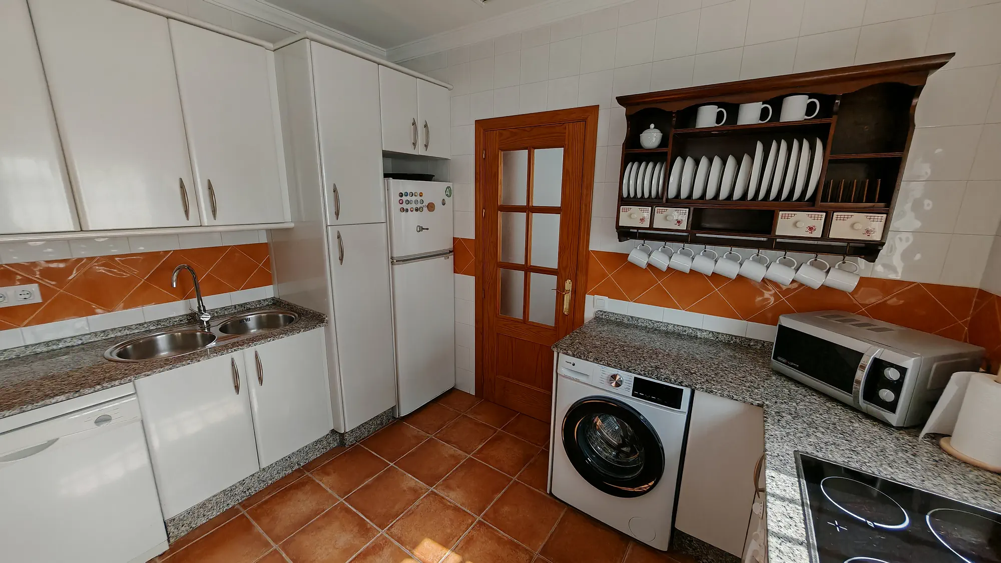 La cocina del chalet en Caños de Meca está totalmente equipada y pensada para disfrutar de una estancia cómoda y práctica. Con un diseño funcional, mobiliario en tonos blancos y encimeras de granito, combina estilo tradicional y comodidad moderna.