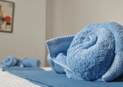 Cada una de las tres habitaciones cuenta con camas confortables, ropa de cama de calidad, amplios armarios empotrados y detalles cuidados que aportan un ambiente hogareño y relajado. Las ventanas dejan entrar la luz natural y la brisa marina, creando un espacio perfecto para desconectar y dormir profundamente.