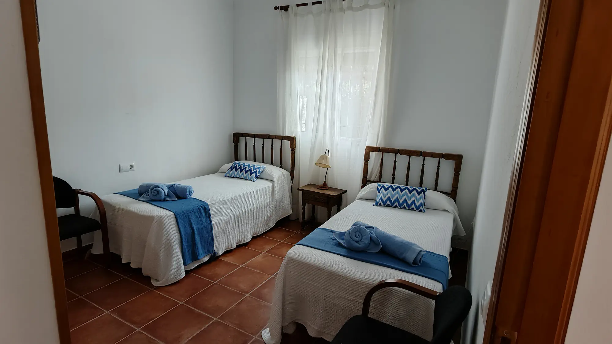 Los tres dormitorios del chalet en Caños de Meca están diseñados para ofrecer descanso y frescura tras un día de playa o excursiones por el Parque Natural de La Breña. Amplios, luminosos y con una decoración en tonos blancos y azules, transmiten una sensación de calma muy acorde con el entorno costero.